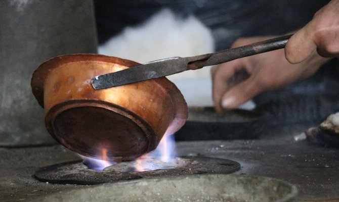 Kalaylanmış bakır kazanda pişirilen yemeğin daha lezzetli olduğunu söyleyen kalay ustası Özata, kalaylı bakırın çevredeki enerjiyi topladığını dile getirdi.