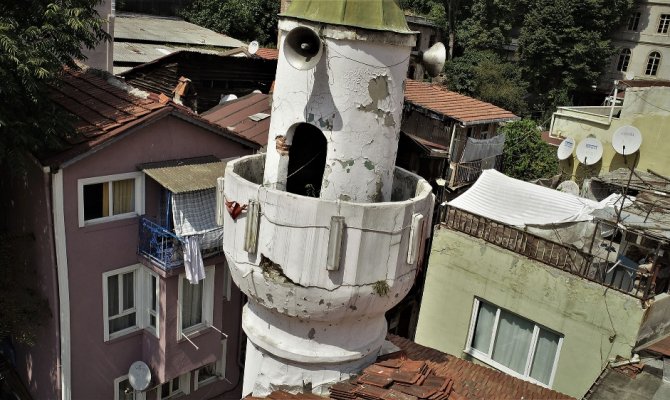 Beyoğlu'ndaki Tarihi Sefer Kethüda (Bostaniçi) Camisi'nin yıkılmak üzere olan minaresi vatandaşları tedirgin ediyor. Çökme tehlikesiyle karşı karşıya olan minareye rağmen vatandaşlar camide ibadetlerine devam ederken minarenin son durumu havadan görüntülendi.
