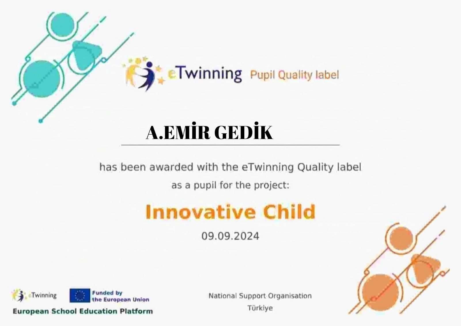 3-E sınıfı öğretmeni Hatice Önen ve öğrencilerinden Ahmet Emir Gedik, yürüttükleri Innovative Child (Yenilikçi Çocuk) adlı eTwinning STEM projesiyle hem ulusal hem de Avrupa ödülü kazanarak Kahramanmaraş’ın gururu oldu.