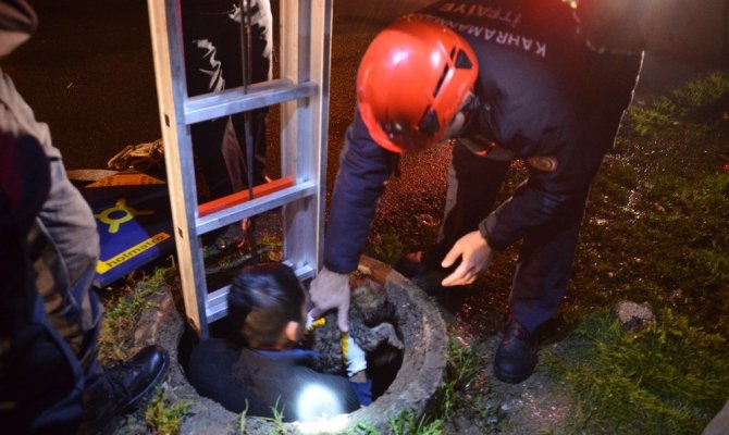 Polis ekiplerinin talebi ile olay yerine gelen itfaiye ekipleri, kanalizasyon kapağı çevresinde yer alan aparatları sökerek aşağı merdiven uzattı. Merdiven uzatılmasıyla daha daralan çukura itfaiye personeli giremeyince, ihbarı yapan Ramazan Kara, bir çift eldivenle aşağı inerek köpeği sıkıştığı yerden kurtardı.