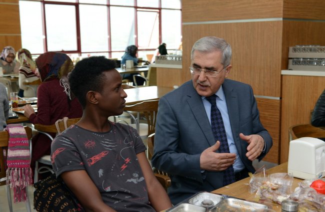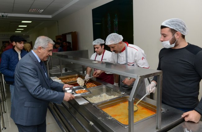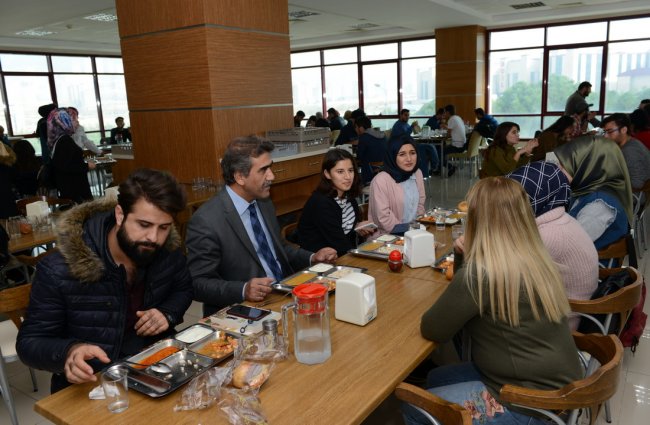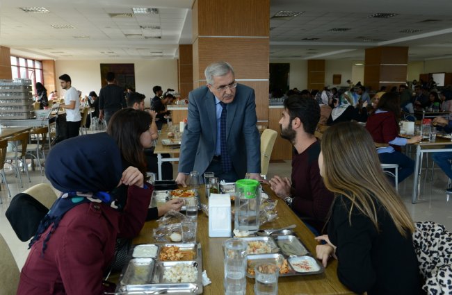 KSÜ Avşar Yerleşkesi Merkez Kafeteryada öğrencilerle birlikte yemek yiyen Rektör Can’a Rektör Yardımcıları Prof. Dr. Zekeriya Pak ve Prof. Dr. Kadir Saltalı eşlik etti.