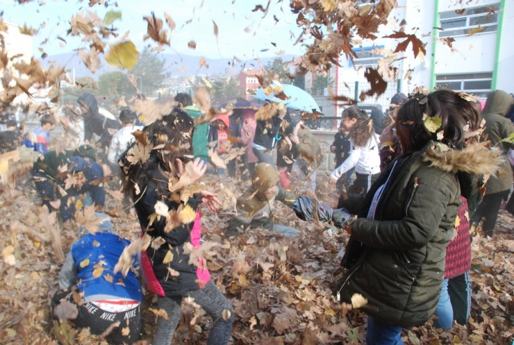 Tokat'ta "Sonbahara veda, kışa merhaba" etkinliğinde öğrenciler, okul girişine dökülen bir kamyon yaprakla eğlenceli dakikalar geçirdi.