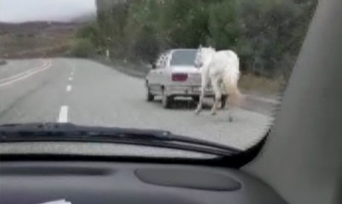 Sabah saatlerinde karayolunda ilerleyen sürücüler, otomobilin arkasına iple bağlı atı gördü. Sürücüler şaşkına döndükleri manzarayı cep telefonları ile kaydetti. Görenlerin tepkisine yol açan sürücü ise tepkilere aldırış etmeden arkasına at bağladığı otomobil ile yoluna devam etti.