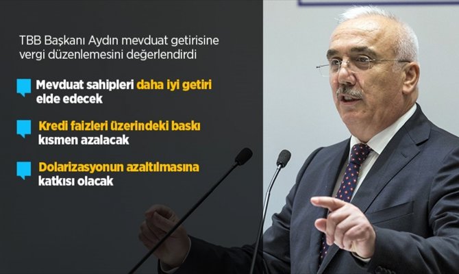 Türkiye Bankalar Birliği (TBB) Başkanı Hüseyin Aydın, mevduat getirisine vergi düzenlemesinde temel hedefin, milli para ile tasarrufun teşvik edilmesi olduğunu belirterek, "Düzenlemenin, banka bilançolarının para birimleri itibarıyla zaman içinde dengeye gelmesi ve dolarizasyonun belirli ölçülerde azaltılması yönünde de katkısı olacağını düşünüyorum." dedi.