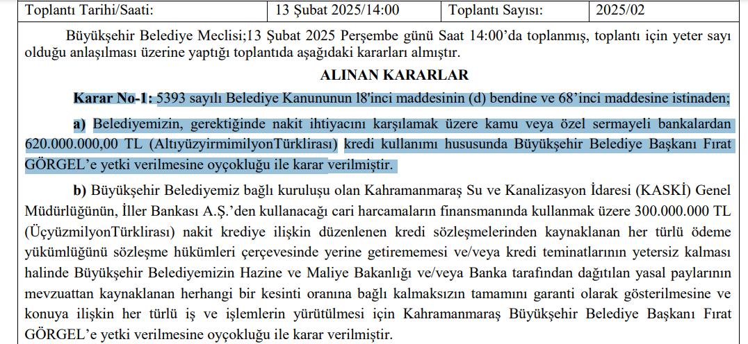 Meclis üyelerinin oyçokluğu ile alınan bu karar doğrultusunda, Kahramanmaraş Büyükşehir Belediye Başkanı Fırat Görgel’e, kredi kullanımına ilişkin gerekli işlemleri yapma yetkisi verildi.(Marasgundem-Özel)