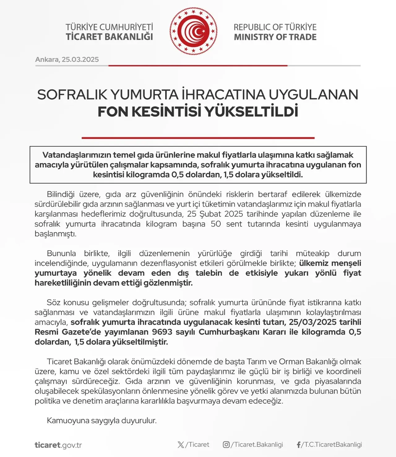 Bakanlıktan yapılan açıklamada, bu düzenlemenin temel gıda ürünlerinde spekülatif fiyat artışlarını önlemek ve vatandaşların yumurtaya daha uygun fiyatlarla erişmesini sağlamak amacıyla hayata geçirildiği belirtildi.