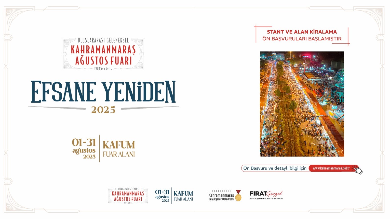 1 – 31 Ağustos 2025 tarihleri arasında KAFUM Fuar Alanında düzenlenecek olan fuarda yer almak isteyen esnaflar için stant ve alan kiralama ön başvuruları başladı. Fuarda stant açmak isteyen esnaf ve işletmeler, https://kahramanmaras.bel.tr/duyuru/2025/06/11/uluslararasi-geleneksel-agustos-fuari-esnaf-on-basvuru-formu adresi üzerinden çevrimiçi olarak başvuru yapabiliyor.