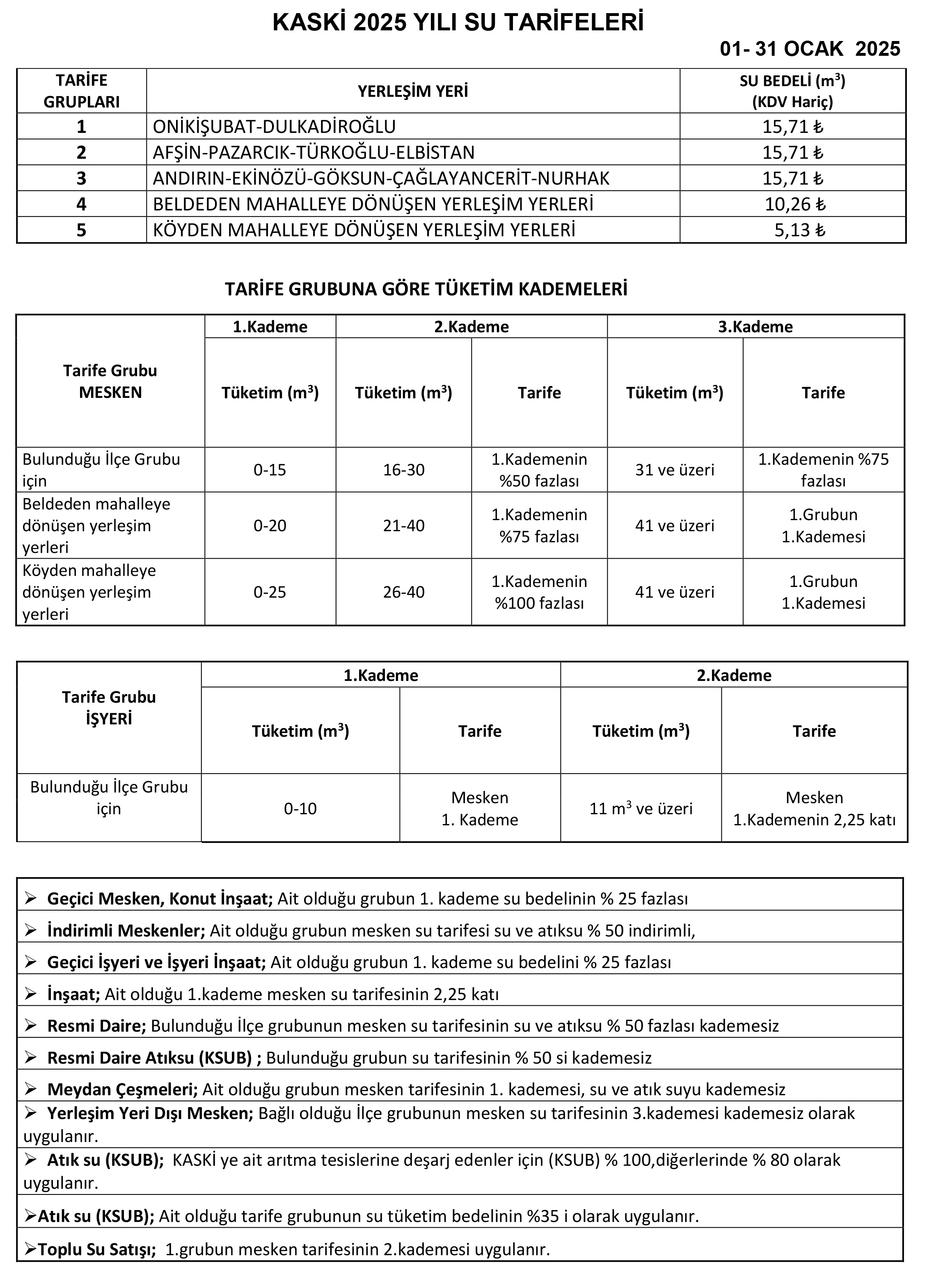 Kahramanmaraş'ta 2025 yılı Ocak ayı su fiyatı belli oldu.