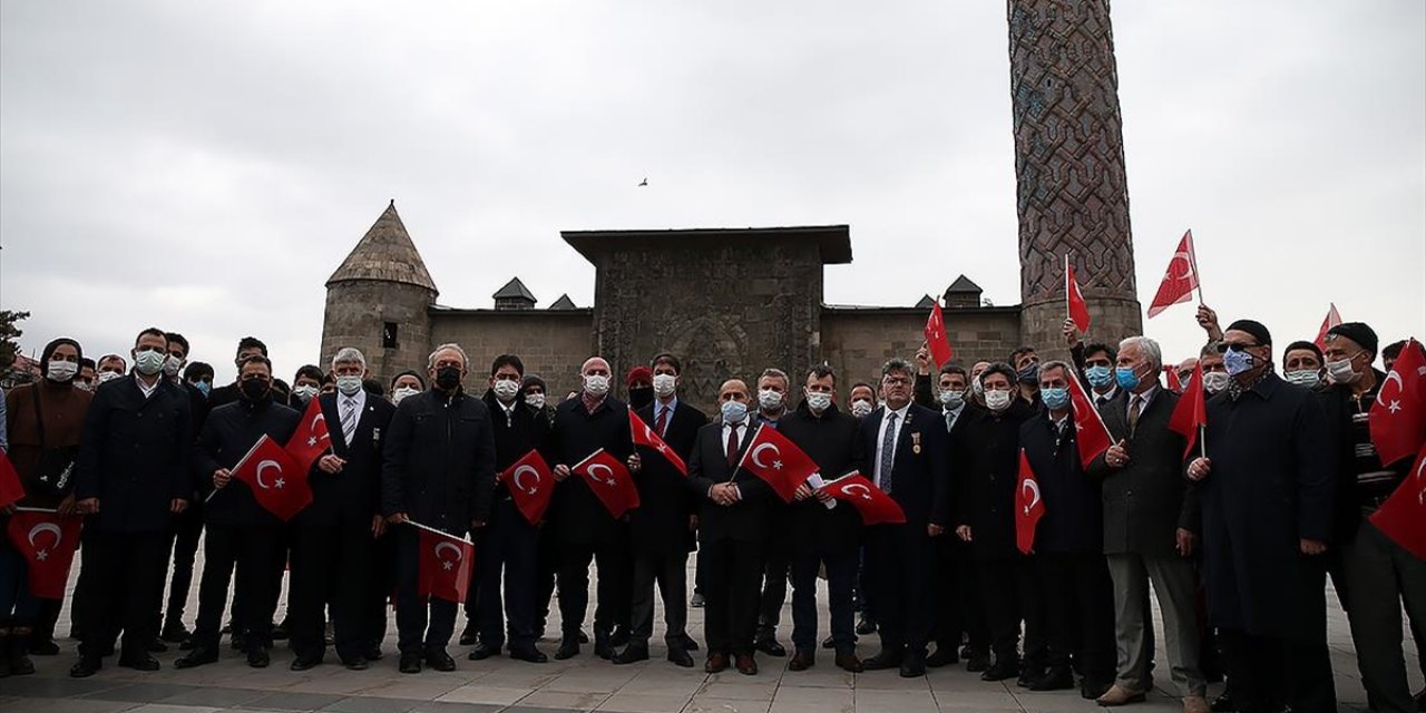 Erzurum'da Yakutiye Kent Meydanı'nda bir araya gelen sivil toplum kuruluşu temsilcileri ellerinde Türk bayraklarıyla bazı emekli amirallerin açıklamalarına ilişkin basın açıklaması yaptı.