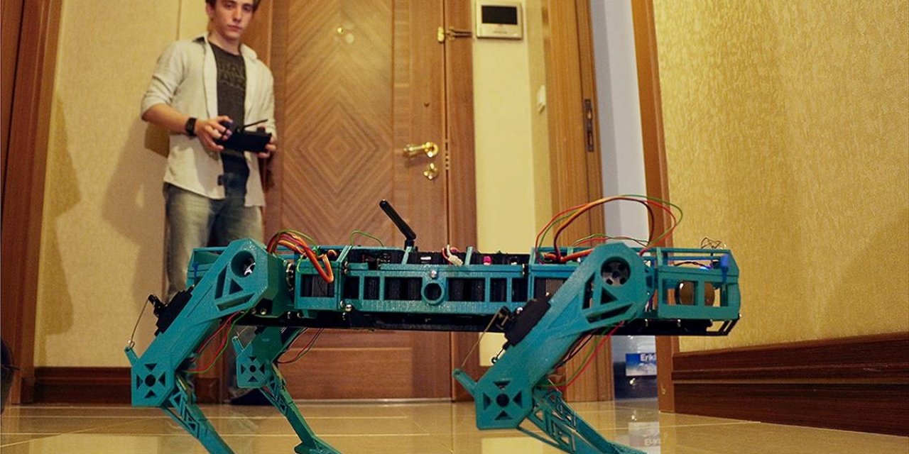 "Farklı projeler belirleyip yazılım, donanım ve elektroniğini kendim yapmaya başladım. Kovid-19 salgını döneminde herkes evlere kapandı. Okullar da uzaktan eğitim sistemine geçince gençler evde kaldı. Bu dönemi iyi değerlendirmek istedim. Robot köpek yapma fikri oluştu. Yaklaşık 6 aylık çalışma sonunda tasarladım. Donanımı, yazılımı ve tasarımı bana ait. Tasarım programı olarak Fusion 360'ı kullandım. 3 boyutlu yazıcıyla plastik aksamlarını kendim çıkarttım. Elektrik ve veri dağıtma tesisatlarını çeşitli programla tasarlayıp lehimledim. Arduino yazılımını kullandım. Kinematik formüllerini bizzat yazdım."