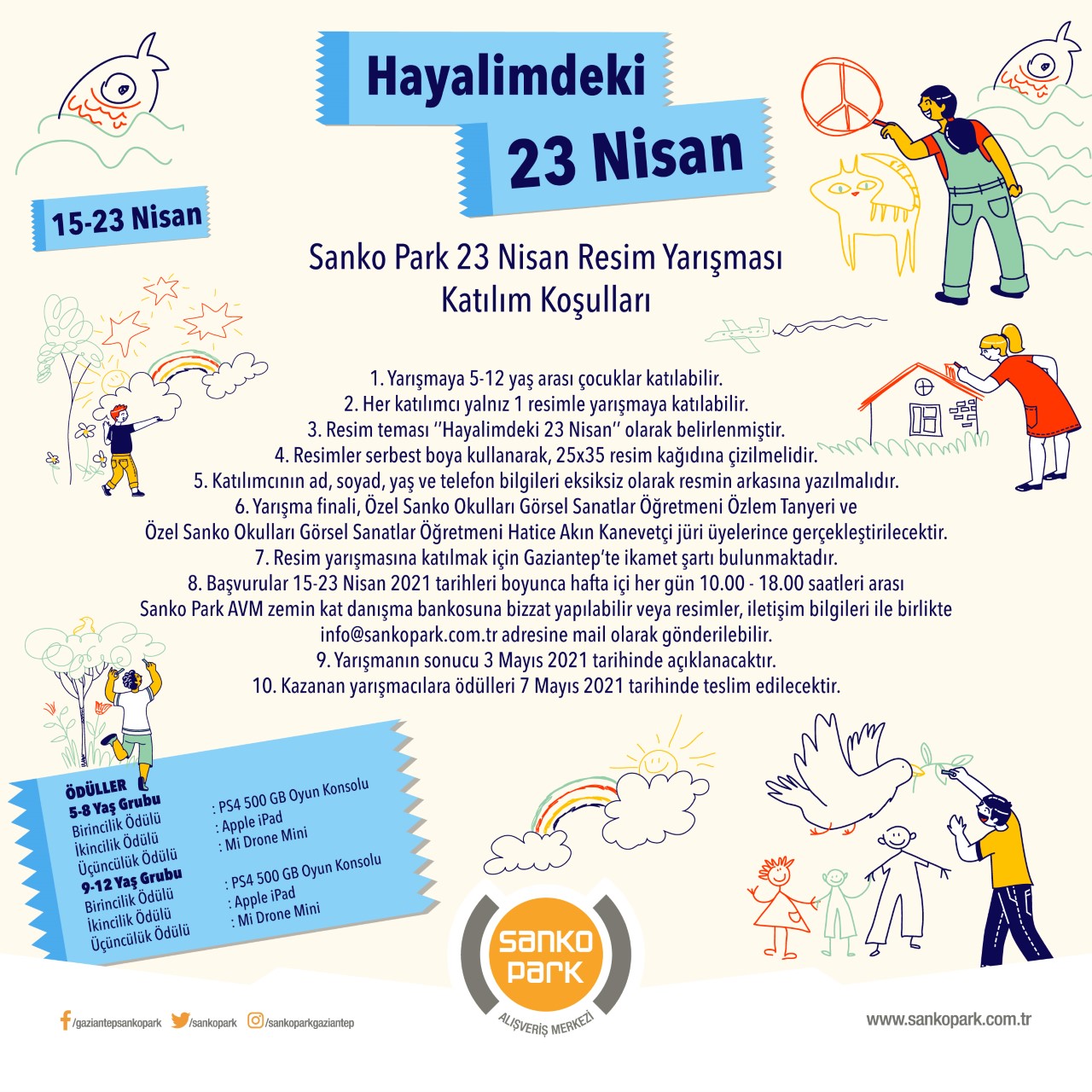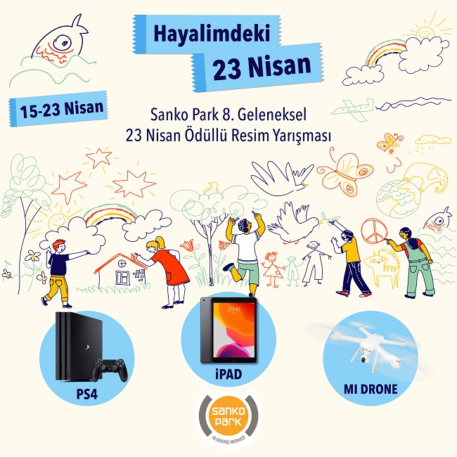 Bu yıl sekizincisi düzenlen resim yarışmasına katılmak isteyenler ‘‘Hayalimdeki 23 Nisan’’ temalı eserlerini, SANKO Park danışma bankosuna teslim ederek veya iletişim bilgileri ile birlikte [email protected] adresine maille göndererek katılım sağlayabilecek.