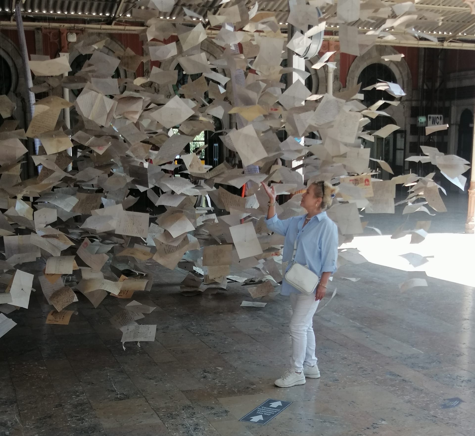 İstanbul Sirkeci Gar’ında bulunan sergide sizi tavandan tabana doğru inen birbirlerine tellerle bağlı bir göçmen kuş sürüsünü andıran A4 ten karton baskıları yapılmış her dilde mektuplar karşılıyor. İnanılmaz bir sunum olmuş, gideceği yere ulaşamayan, hasret, sevgi, ilgi, alaka yani ki mektuplarda ne varsa havada kalmış. Ulaşamamış gideceği yere onlarca, yüzlerce mektup.