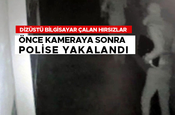 DİZÜSTÜ BİLGİSAYAR ÇALAN HIRSIZLAR ÖNCE KAMERAYA SONRA POLİSE YAKALANDI
