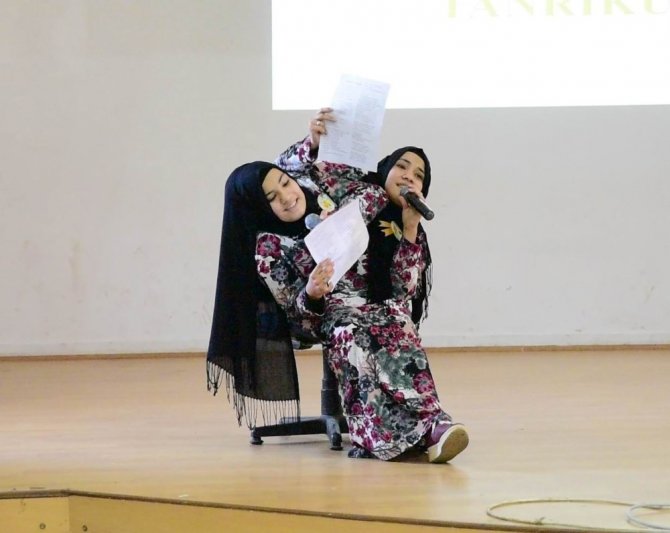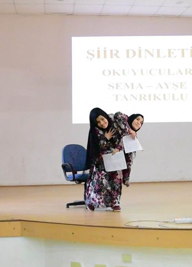 Kahramanmaraş'ta Mevlit Kandili kapsamında düzenlenen programında, 18 yaşına giren siyam ikizi Sema ve Ayşe'nin okuduğu şiir dinleyenleri duygulandırdı.