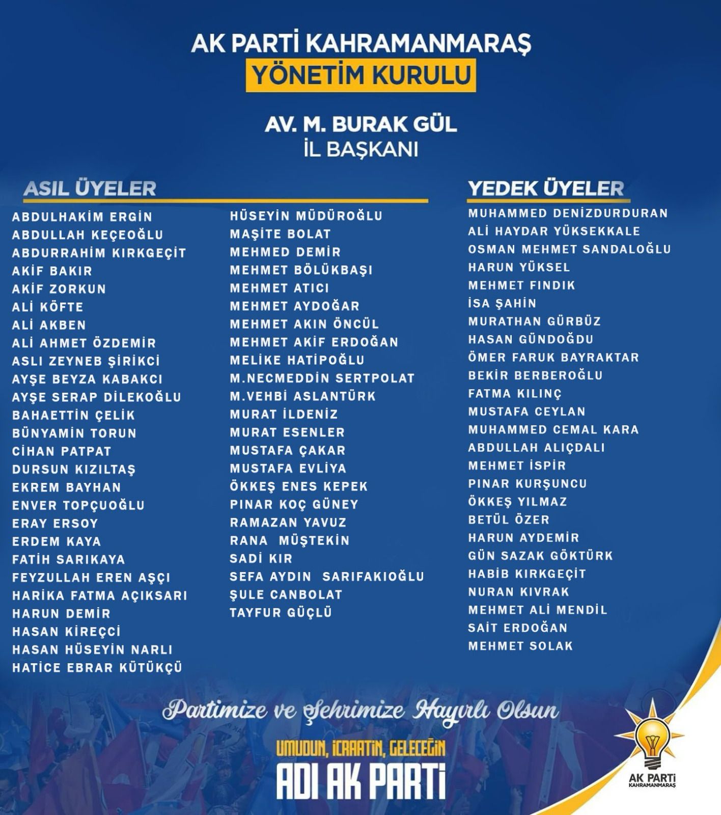 Kongre sırasında, AK Parti Kahramanmaraş İl Yönetim Kurulu üyeleri de belirlendi. İl Başkan Adayı olarak Muhammed Burak Gül’ün yer aldığı listede, asil ve yedek üyeler, disiplin kurulu üyeleri ile demokrasi hakem kurulu üyeleri açıklandı.