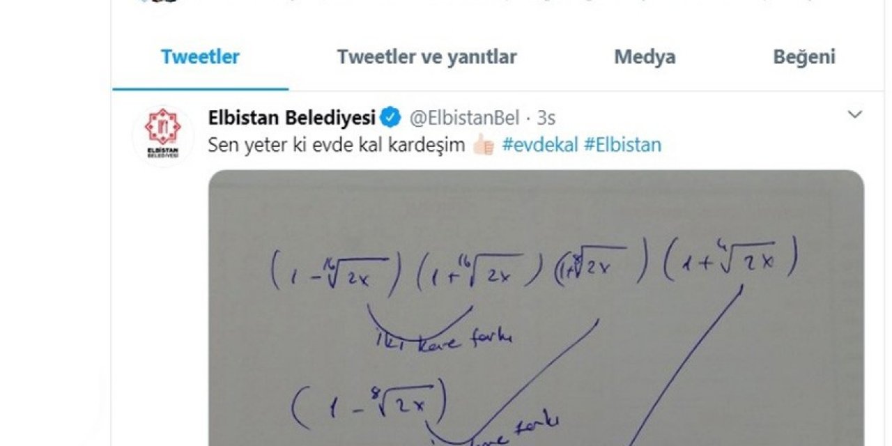Kahramanmaraş'ın Elbistan ilçesinde üniversite sınavlarına hazırlanan bir genç, çözemediği matematik sorusunu twitter üzerinden Elbistan Belediyesine gönderdi. Elbistan Belediyesi yetkilileri de "Sen yeter ki evde kal kardeşim" diyerek, sorunun çözümünü paylaştı.