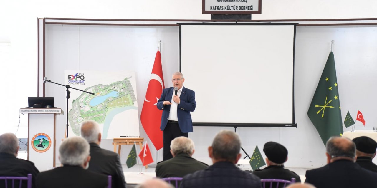 "İnşallah 2023'te gerçekleştireceğimiz bir dünya projesi olan EXPO 2023 projemizde Kafkas kültürümüzü hem ülkemize hem de uluslararası alanda tanıtmış olacağız. 2018'de İtalya'da yapılan genel kurulla 62 ülkenin tümünün oyuyla 2023 EXPO'yu Kahramanmaraş'a aldık. İnşallah bunu yapacağız. Ama bizim birliğimizin ve bütünlüğümüzün devam etmesi lazım. Bu proje dönem olarak 6 buçuk aylık bir proje. Expo alanını yaşam alanına dönüştürmeniz lazım."