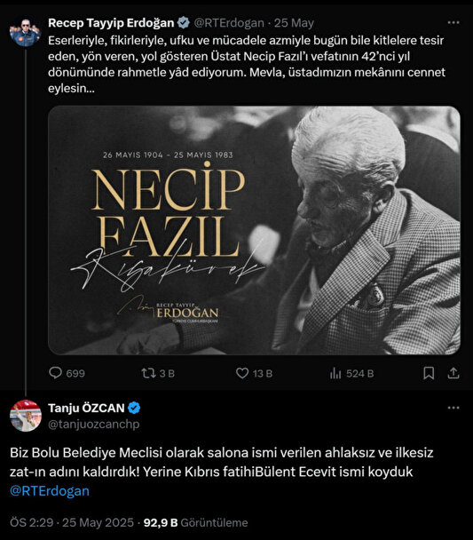 CHP'li Başkan Özcan, sosyal medya hesabından yaptığı açıklamada, Necip Fazıl Kısakürek için “ahlaksız ve ilkesiz zat” ifadelerini kullanarak tepkilerin odağı haline geldi. Özcan’ın bu ifadeleri, usta şairin vefatının 42. yıl dönümünde Cumhurbaşkanı Recep Tayyip Erdoğan’ın yaptığı paylaşım sonrası geldi.