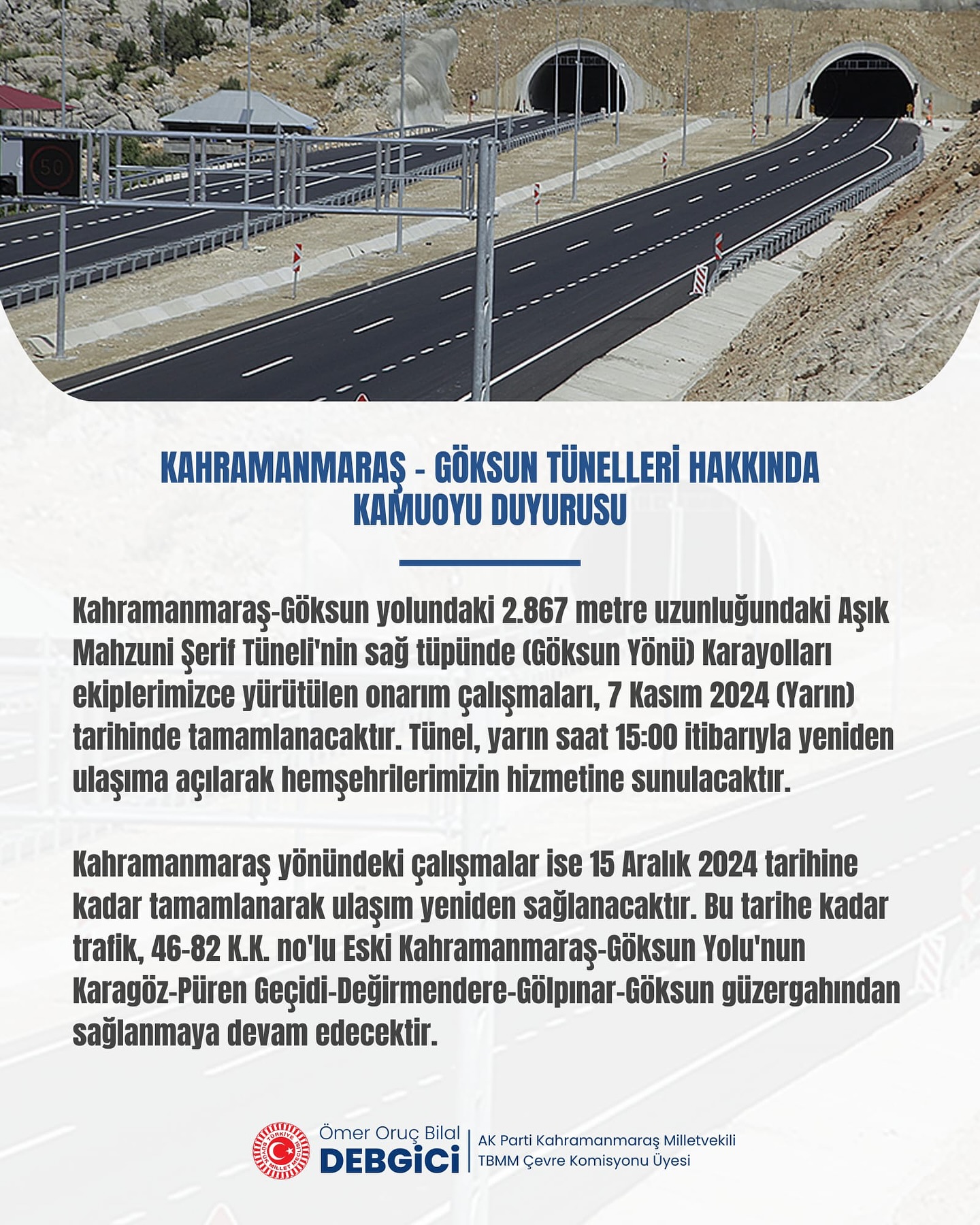 AK Parti Kahramanmaraş Milletvekili ve TBMM Çevre Komisyonu Üyesi Ömer Oruç Bilal Debgici, Kahramanmaraş ile Göksun arasında ulaşımı kolaylaştıran Aşık Mahzuni Şerif Tüneli'nde, Karayolları ekipleri tarafından yürütülen onarım çalışmalarının tamamlanmak üzere olduğunu bildirildi.