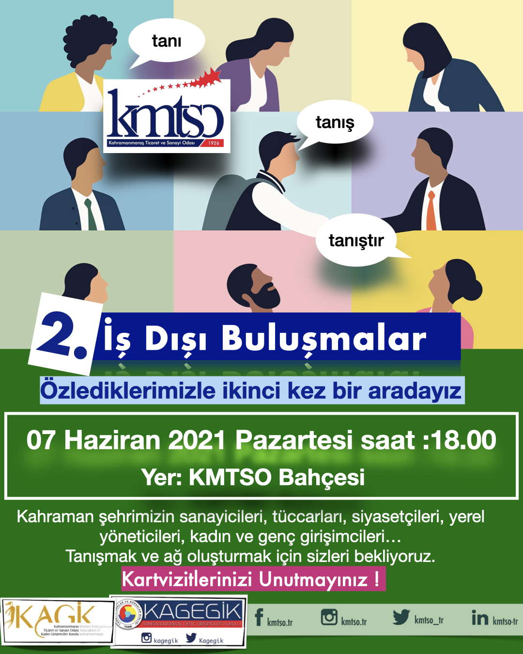 KMTSO üyelerinin tanışması ve işbirliklerinin güçlendirilmesi hedefiyle Kahramanmaraş Kadın Girişimciler Kurulu (KAGİK) ve Kahramanmaraş Genç Girişimciler Kurulu (KAGEGİK)’nun organize ettiği “İş Dışı Buluşmaları” iş dünyasının birlik ve beraberliğinin güçlenmesine katkı sağlamak için gerçekleştiriliyor.