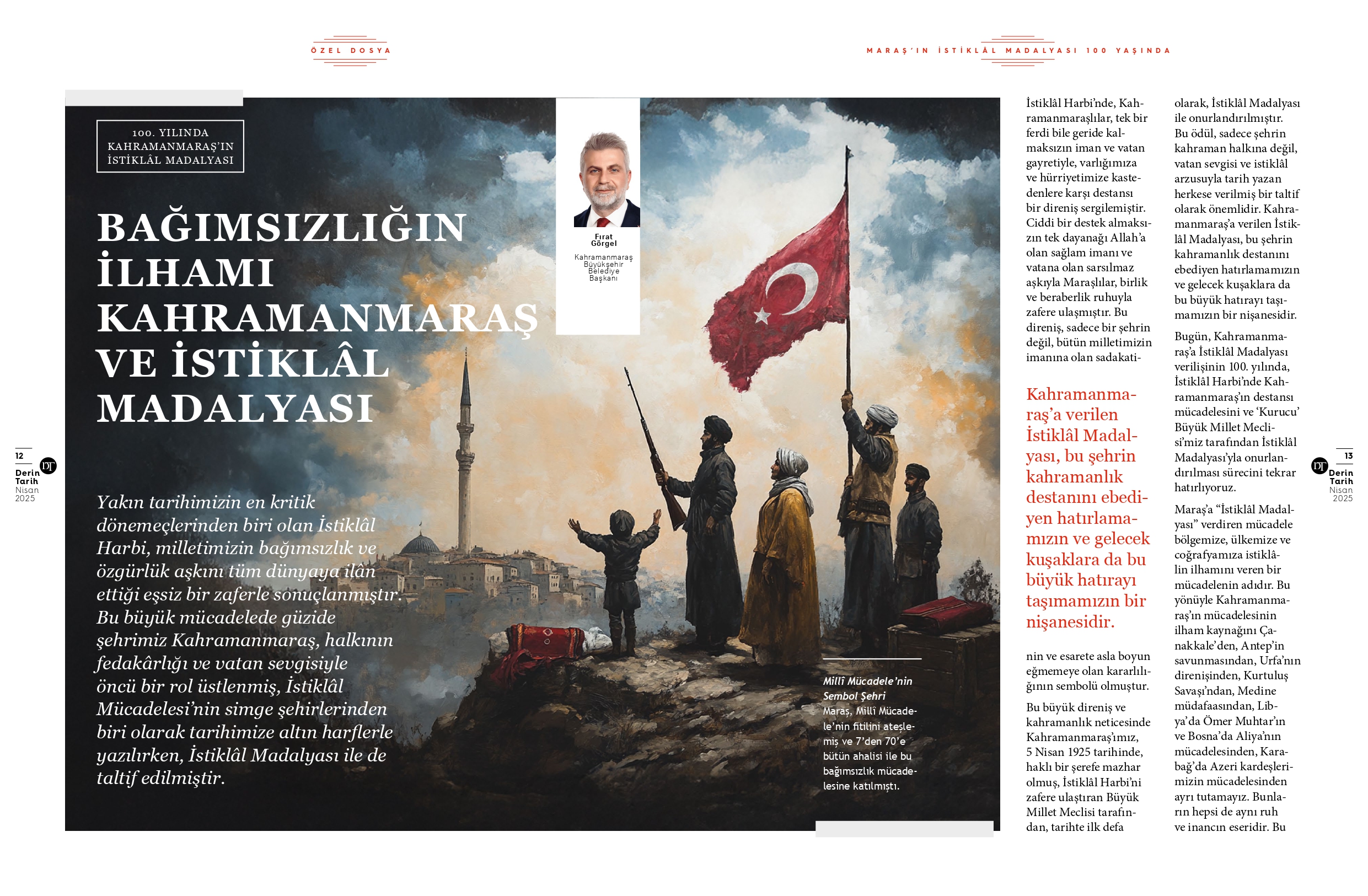 Dosya kapsamında Kahramanmaraş Büyükşehir Belediye Başkanı Fırat Görgel ile yapılan özel röportaj da dergide yer aldı. Görgel, Kahramanmaraş’a İstiklâl Madalyası verilmesinin 100. yılına dikkat çekerek şu değerlendirmelerde bulundu:“Yakın tarihimizin en kritik dönemeçlerinden biri olan İstiklâl Harbi, milletimizin bağımsızlık ve özgürlük aşkını tüm dünyaya ilân ettiği eşsiz bir zaferle sonuçlanmıştır. Bu büyük mücadelede güzide şehrimiz Kahramanmaraş, halkının fedakârlığı ve vatan sevgisiyle öncü bir rol üstlenmiş, İstiklâl Mücadelesi’nin simge şehirlerinden biri olarak tarihimize altın harflerle yazılırken, İstiklâl Madalyası ile de taltif edilmiştir.” Röportajda Başkan Görgel ayrıca, Maraş’ın sadece kendi direnişiyle değil, Anadolu genelinde özgürlük ve bağımsızlık fikrinin güç kazanmasında da önemli bir rol oynadığını vurguladı.