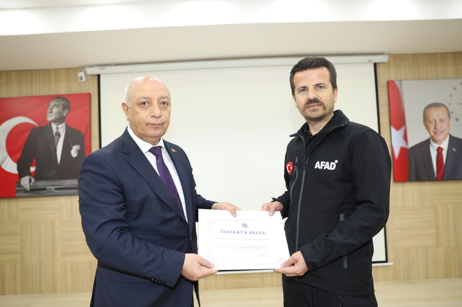KİÜ Türkoğlu MYO Müdürü Öğr. Gör. Dr. Mustafa Doğan’ın da yüksekokulun eğitim faaliyetlerine ilişkin bilgiler aktardığı toplantı, sektör temsilcilerine teşekkür belgesi takdimi ile devam etti. Belgeler, KİÜ Rektörü Prof. Dr. İsmail Bakan, Kahramanmaraş Büyükşehir Belediyesi Genel Sekreter Yardımcısı Mutlu Kaya, Türkoğlu Belediye Başkanı Mehmet Karaca, KİÜ Rektör Yardımcısı Prof. Dr. Burcu Erşahan, KİÜ İlahiyat Fakültesi Dekanı Prof. Dr. Hulusi Arslan ve MYO Müdürü Öğr. Gör. Dr. Mustafa Doğan tarafından, kamu ve özel sektörde faaliyet gösteren kurum ve firma temsilcilerine takdim edildi.