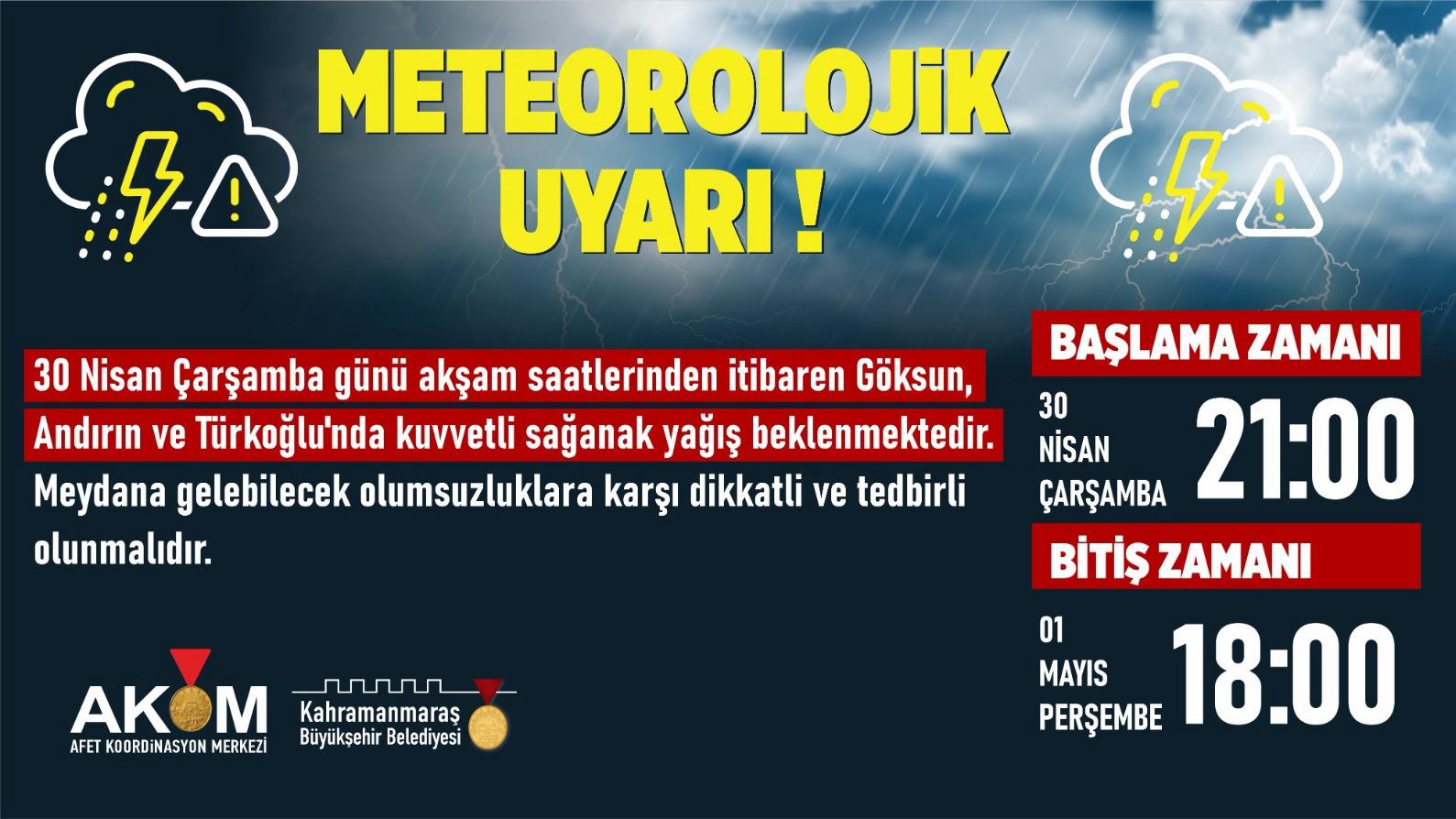 Kahramanmaraş Büyükşehir Belediyesi Afet Koordinasyon Merkezi, 30 Nisan Çarşamba akşamından itibaren Andırın, Göksun ve Türkoğlu ilçelerinde etkili olması beklenen gök gürültülü kuvvetli sağanak yağışlara karşı vatandaşları uyardı.