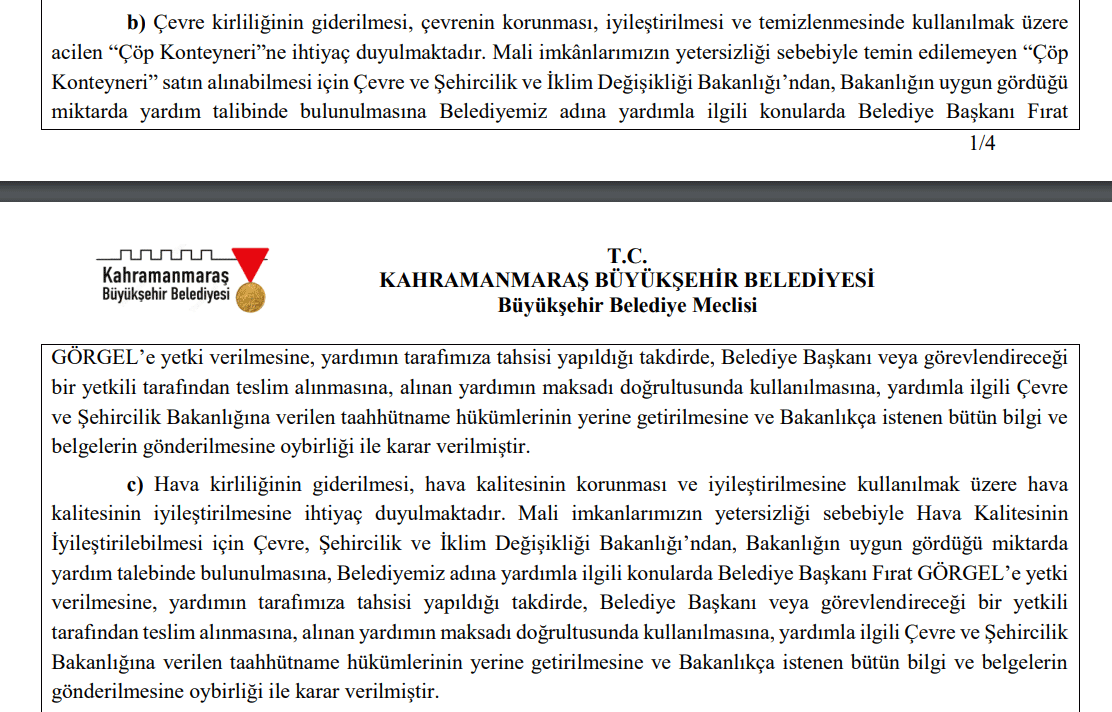 “Çevre kirliliğinin giderilmesi, çevrenin korunması, iyileştirilmesi ve temizlenmesinde kullanılmak üzere acilen “Çöp Konteyneri”ne ihtiyaç duyulmaktadır. Mali imkânlarımızın yetersizliği sebebiyle temin edilemeyen “Çöp Konteyneri” satın alınabilmesi için Çevre ve Şehircilik ve İklim Değişikliği Bakanlığı’ndan, Bakanlığın uygun gördüğü miktarda yardım talibinde bulunulmasına Belediyemiz adına yardımla ilgili konularda Belediye Başkanı Fırat GÖRGEL’e yetki verilmesine, yardımın tarafımıza tahsisi yapıldığı takdirde, Belediye Başkanı veya görevlendireceği bir yetkili tarafından teslim alınmasına, alınan yardımın maksadı doğrultusunda kullanılmasına, yardımla ilgili Çevre ve Şehircilik Bakanlığına verilen taahhütname hükümlerinin yerine getirilmesine ve Bakanlıkça istenen bütün bilgi ve belgelerin gönderilmesine oybirliği ile karar verilmiştir.” (Maraşgündem-Özel)