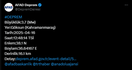 Güne saat 05.04'te depremle uyanan Kahramanmaraş'ta bir deprem daha oldu. AFAD verilerine göre saat 12:41'de Göksun merkezli 3.7 büyüklüğünde bir deprem daha oldu.