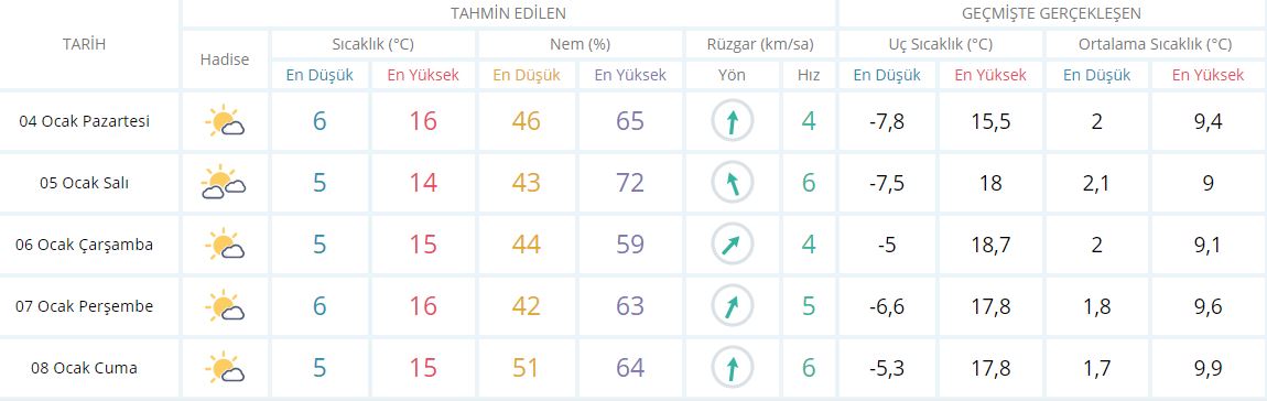 4 Ocak Pazartesi: (Az bulutlu) En düşük hava sıcaklığı 6, en yüksek hava sıcaklığı 16 derece. En düşük nem oranı 46, en yüksek nem oranı 65. Hakim rüzgar yönü güneyden kuzeye 4 (km/sa)