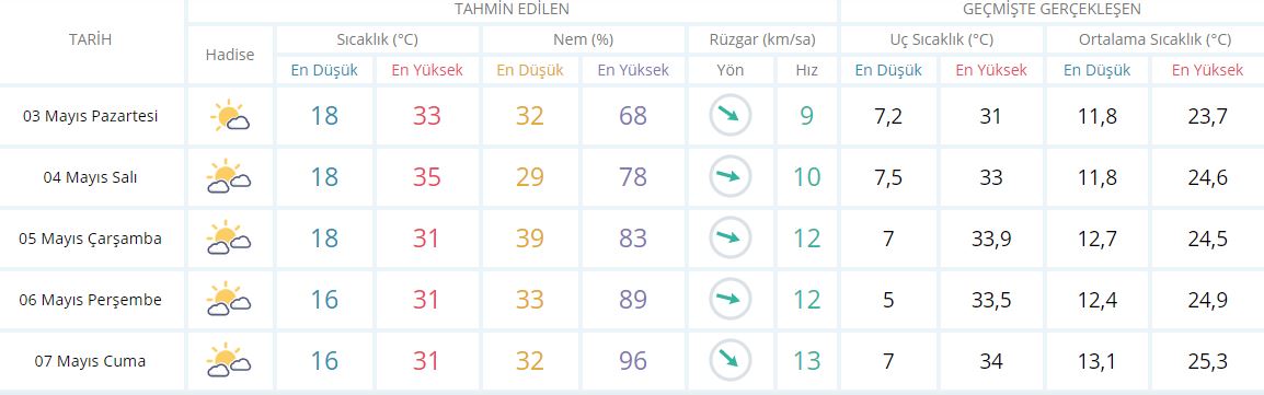 5 Mayıs Çarşamba: (Parçalı Bulutlu) En düşük hava sıcaklığı 18, en yüksek hava sıcaklığı 35 derece. En düşük nem oranı 39, en yüksek nem oranı 83. Hakim rüzgar yönü batıdan doğuya 12 (km/sa)