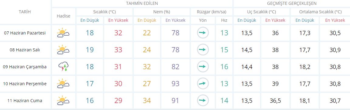 7 Haziran Pazartesi: (Parçalı Bulutlu) En düşük hava sıcaklığı 18, en yüksek hava sıcaklığı 32 derece. En düşük nem oranı 22, en yüksek nem oranı 78. Hakim rüzgar yönü batıdan doğuya 13 (km/sa)
