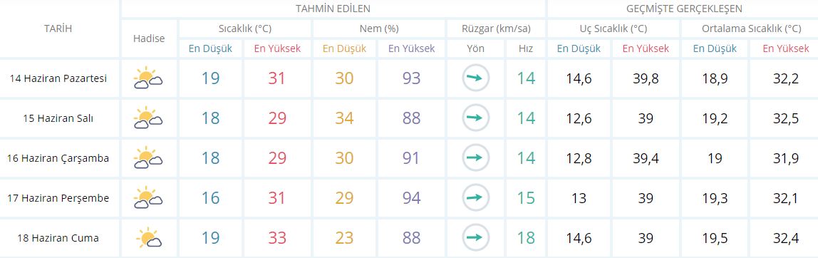 14 Haziran Pazartesi: (Parçalı Bulutlu) En düşük hava sıcaklığı 19, en yüksek hava sıcaklığı 31 derece. En düşük nem oranı 30, en yüksek nem oranı 93. Hakim rüzgar yönü batıdan doğuya 14 (km/sa)