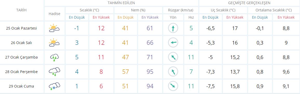 25 Ocak Pazartesi: (Parçalı bulutlu) En düşük hava sıcaklığı -1, en yüksek hava sıcaklığı 12 derece. En düşük nem oranı 41, en yüksek hem oranı 61. Hakim rüzgar yönü güneyden kuzeye 5 (km/sa)