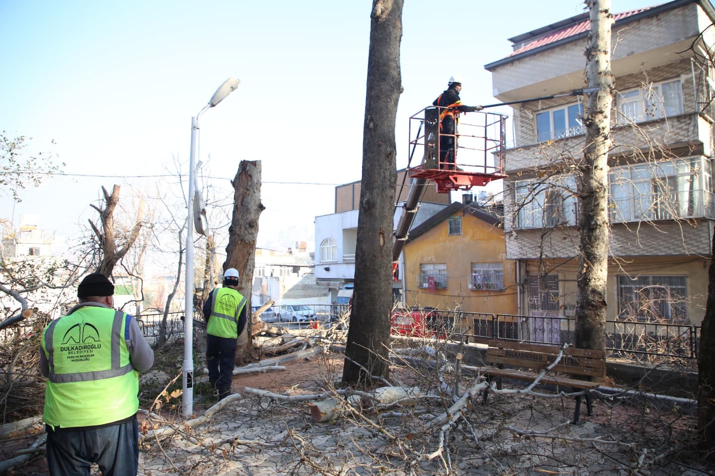 Kahramanmaraş Dulkadiroğlu Belediyesi Park ve Bahçeler Müdürlüğü ekipleri, ağaçların sağlıklı bir şekilde büyümesini sağlamak amacıyla ağaç budama çalışmalarına aralıksız devam ediyor.