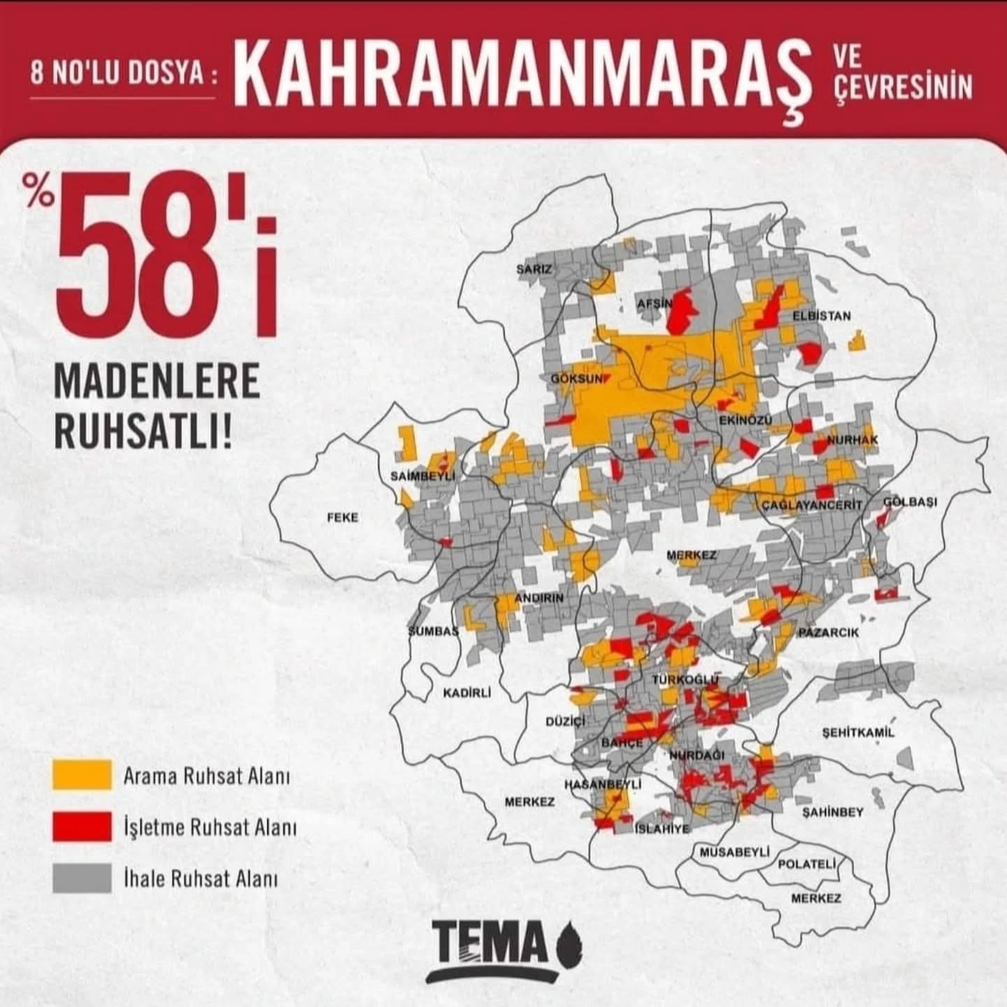 Türkiye ve dünya için ekolojik önemi büyük olan Berit Dağı, Andırın, Binboğa Dağları, Engizek Dağı, Ahır Dağı, Amanos Dağları, Yeşilce, Araban Tepeleri ve Gavur Gölü gibi 9 Önemli Doğa Alanı (ÖDA) da büyük oranda (%69) maden ruhsatlarının etkisi altında bulunuyor.