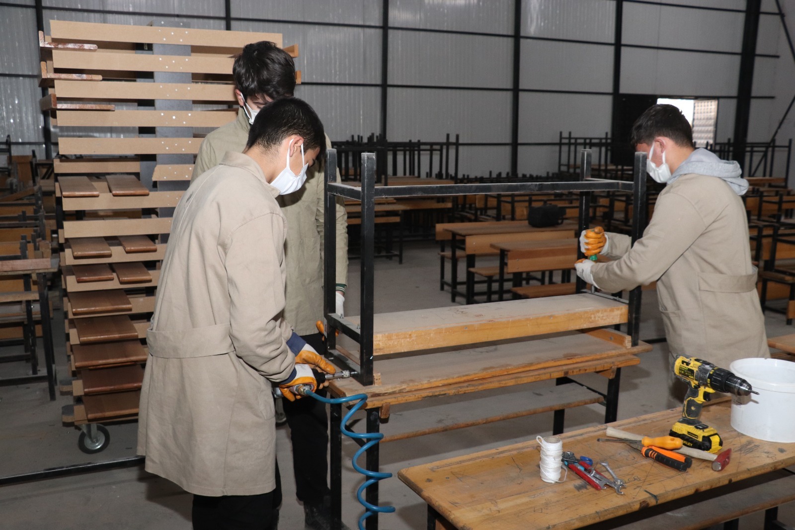 Çeşitli nedenlerle kullanılamayacak hale gelmiş sıralar, İl Milli Eğitim Müdürlüğü tarafından okula naklediliyor. Okula gelen sıralar, talaş alma, zımparalama, dolgu ve vernik işlemleri ile metal aksamın yeniden boyanması, eksik parçalarının tamamlanması ve son olarak montajları yapılarak ilk günkü haline getiriliyor.