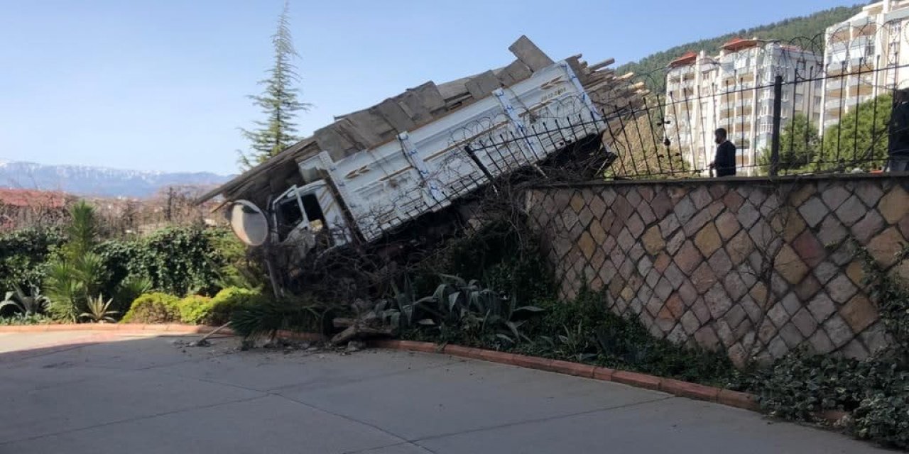 Kahramanmaraş’ta freni patlayan kamyon bir apartmanın istinat duvarına çarparak ancak durabildi.