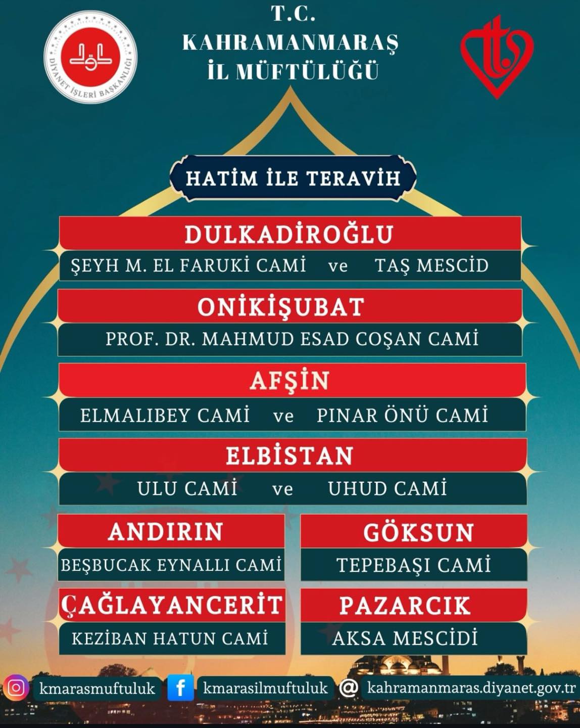 Kahramanmaraş İl Müftülüğü tarafından yapılan duyuruya göre, farklı ilçelerde belirlenen camilerde hatimle teravih namazı eda edilecek.