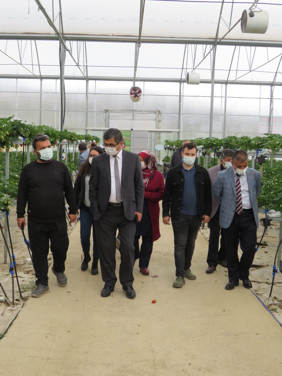 Kahramanmaraş’ın Dulkadiroğlu ilçesine bağlı Şerefoğlu Mahallesinde 11 dekarlık alanda 235 bin çilek fidesi dikilerek üretime başlanan serada İl Tarım ve Orman Müdürü Mustafa Bozkurt, Şube Müdürleri ve teknik personeller tarafından incelemelerde bulunuldu.