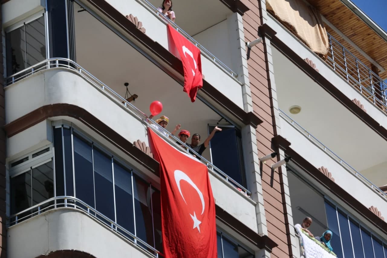 Sirenler eşliğinde geçen ekip araçlarını gören çocuklar ve vatandaşlar ise, ellerindeki Türk Bayrakları sallayarak konvoyu selamladılar.