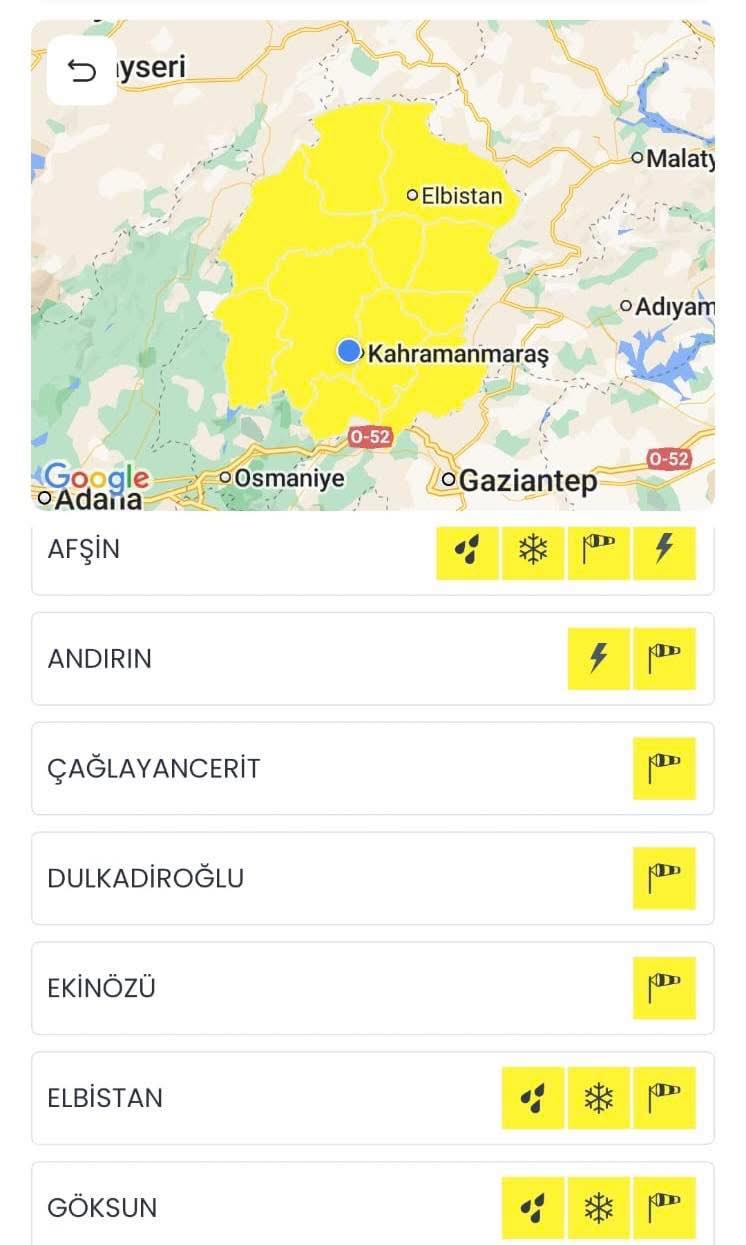Kahramanmaraş'ın Göksun, Afşin ve Elbistan ilçeleri için kuvvetli yağmur ve kar yağışı uyarısı yapıldı.
