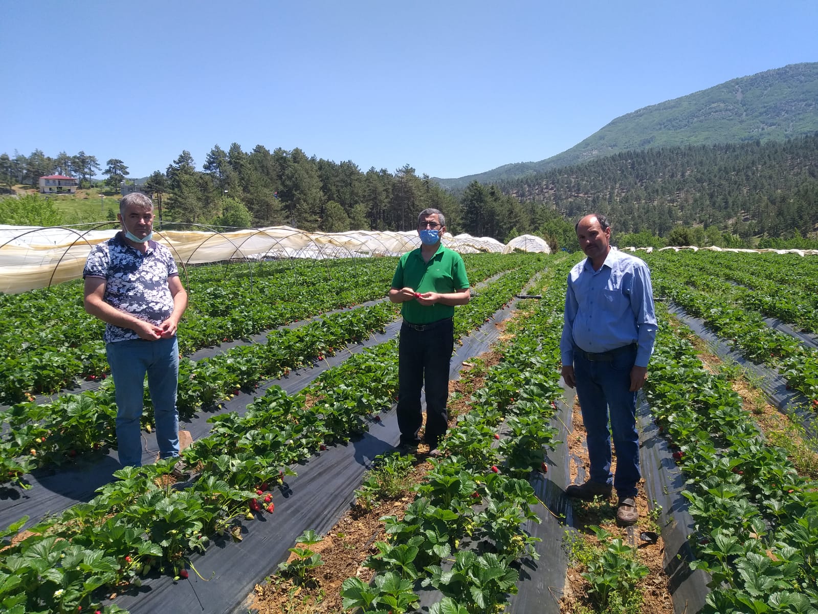 Kahramanmaraş İl Tarım ve Orman Müdürü Mustafa Bozkurt, ekibiyle birlikte Türkoğlu İlçesine bağlı Muratçakıroğlu ve Kaledibi mahallelerinde hasadına başlanan ve yaklaşık 800 dekarda malçlı-frigo fideli çilek yetiştiriciliği yapılan alanlarda incelemelerde bulundu.
