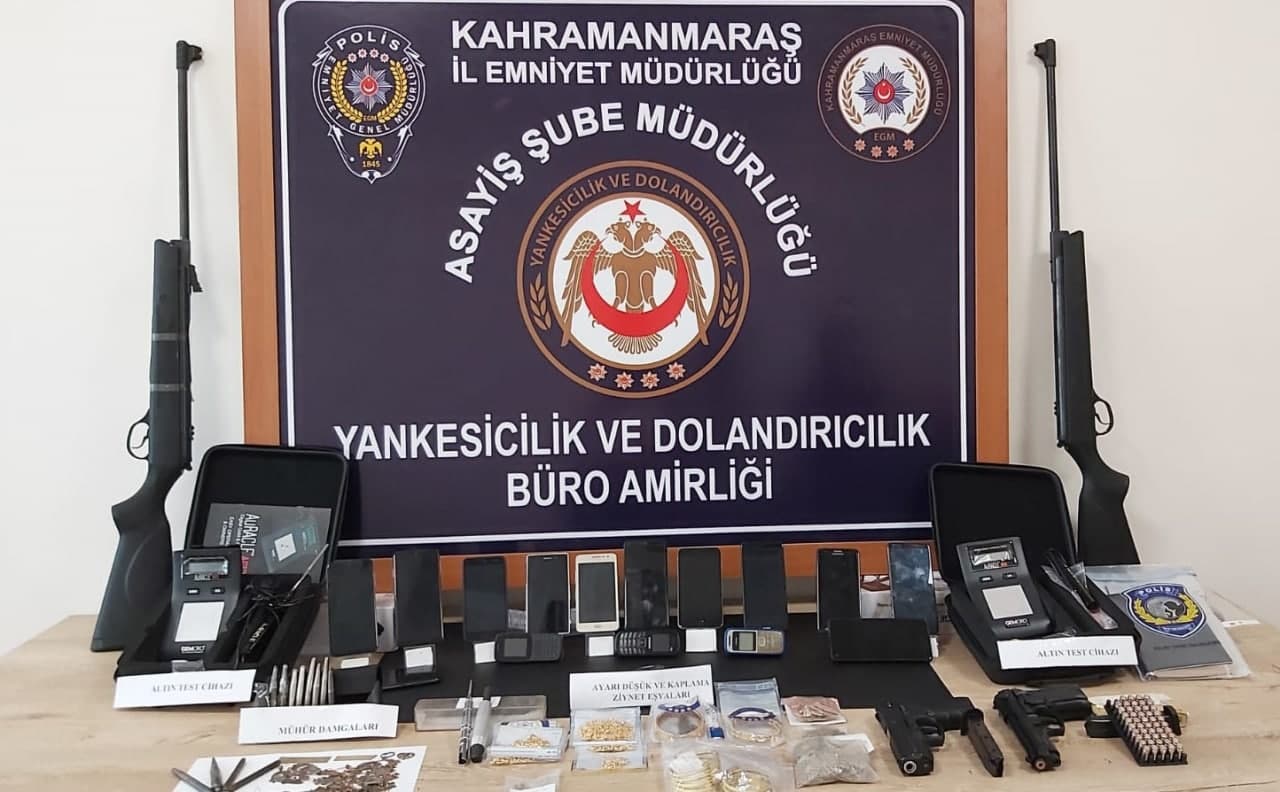 Operasyonda 14 adet telefon, 1.679 vizyon küpe, 21 kolye ve kolye parçası, 17 çift küpe, 42 bileklik ve bilezik parçası, 2 altın ayar test cihazı, 2 yazı ve desen aleti, 28 pul, 12 adet çeşitli kuyumcular adına düzenlenmiş isim ve ayar damgaları, sahte yarım ve tam altın, 3 tüfek, 2 kurusıkı tabanca ele geçirildi.