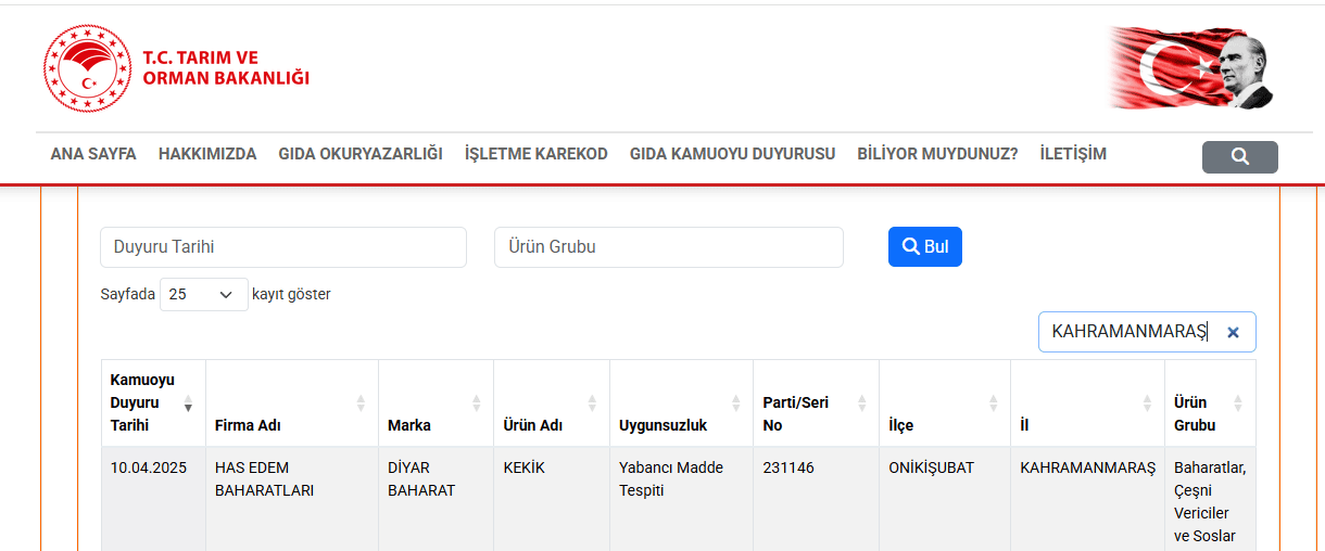 Bakanlığın sağlığı tehlikeye düşürecek gıdalar listesinde, Kahramanmaraş merkezli "Diyar Baharat" markasına ait kekik ürününde yabancı madde tespit edildiği duyuruldu.