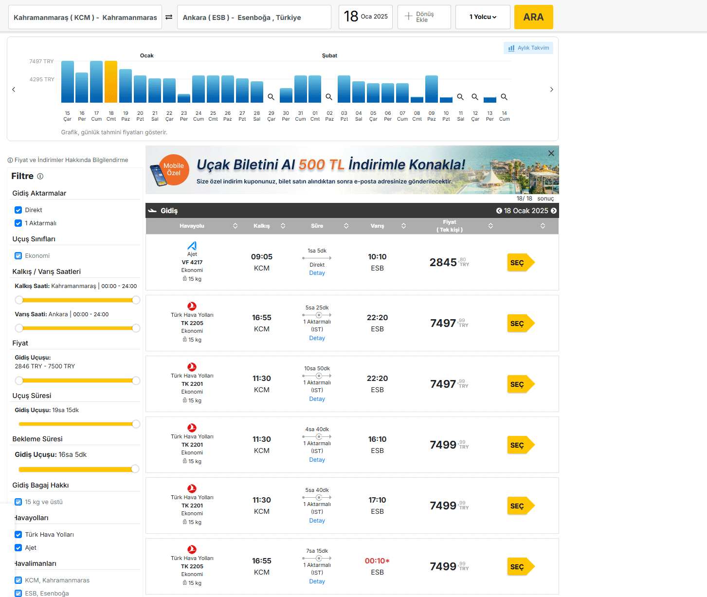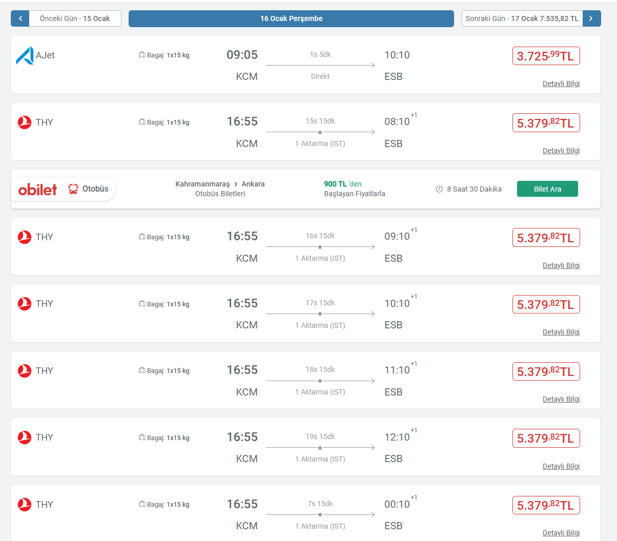 Kahramanmaraş’tan Ankara'ya yapılacak uçuşlar için bilet fiyatları şu sıralar 950 TL civarında seyrederken, 18 Ocak’tan itibaren 3 bin TL'ye, hatta bazı uçuşlar 7 bin TL’ye kadar yükseldi. Bu fiyat artışı, özellikle tatil dönemi için seyahat planlayan aileleri zorluyor. Yüksek bilet fiyatları, ekonomik anlamda da büyük bir yük oluşturuyor.