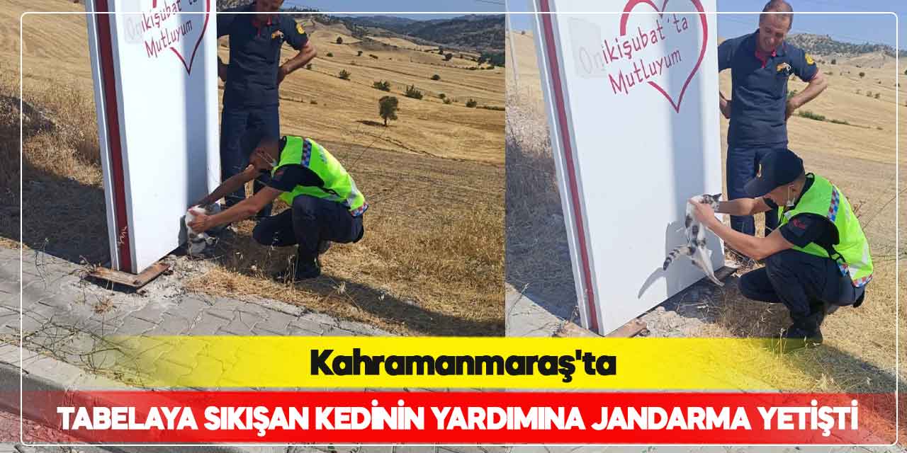 Kahramanmaraş'ta tabelaya sıkışan kedinin yardımına jandarma yetişti