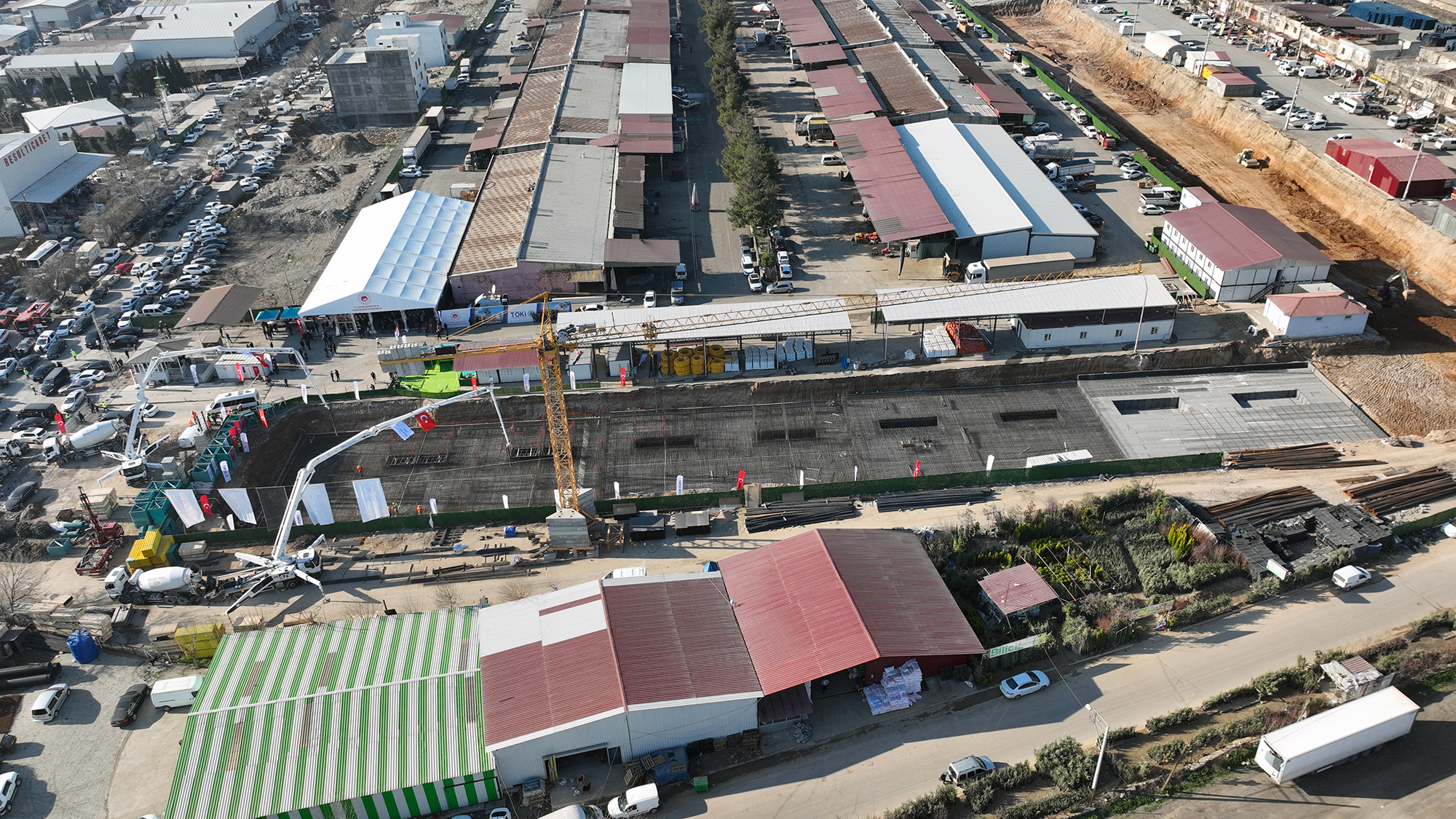 TOKİ Başkanı Mustafa Levent Sungur, “6 Şubat depremlerinde ağır hasar alan Kahramanmaraş’ın önemli tarihi ve kültürel miraslarından Kapalı Çarşı’nın restorasyonuna başladık. Kahramanmaraş Büyükşehir Belediyesi iş birliğiyle tüm mimari ve tarihi özellikler dikkate alınarak 122’si tescilli toplam 140 dükkânın yer aldığı Kapalı Çarşı’yı aslına uygun olarak restore ederek Kahramanmaraş’ımıza tekrar kazandıracağız. Yine depremle birlikte ağır hasar gören Tarihi Demirciler Çarşısı için de çalışmalara başlandı. Burada da 76 iş yerinin restorasyonu yapılarak vatandaşlarımızın hizmetine sunulacak. Yine Kasap Hali’nde cephe sağlıklaştırma ve sokak iyileştirme çalışmalarına başlıyoruz. Bugün temelini atacağımız Toptancılar Sitesi de Kahramanmaraş’ın ticari hayatına ve istihdamına önemli katkı sağlayacaktır. 23 bloktan oluşan 117 dükkânın yer alacağı Toptancılar Çarşısı inşallah kısa sürede esnafımızın hizmetine sunulacak” diye konuştu.