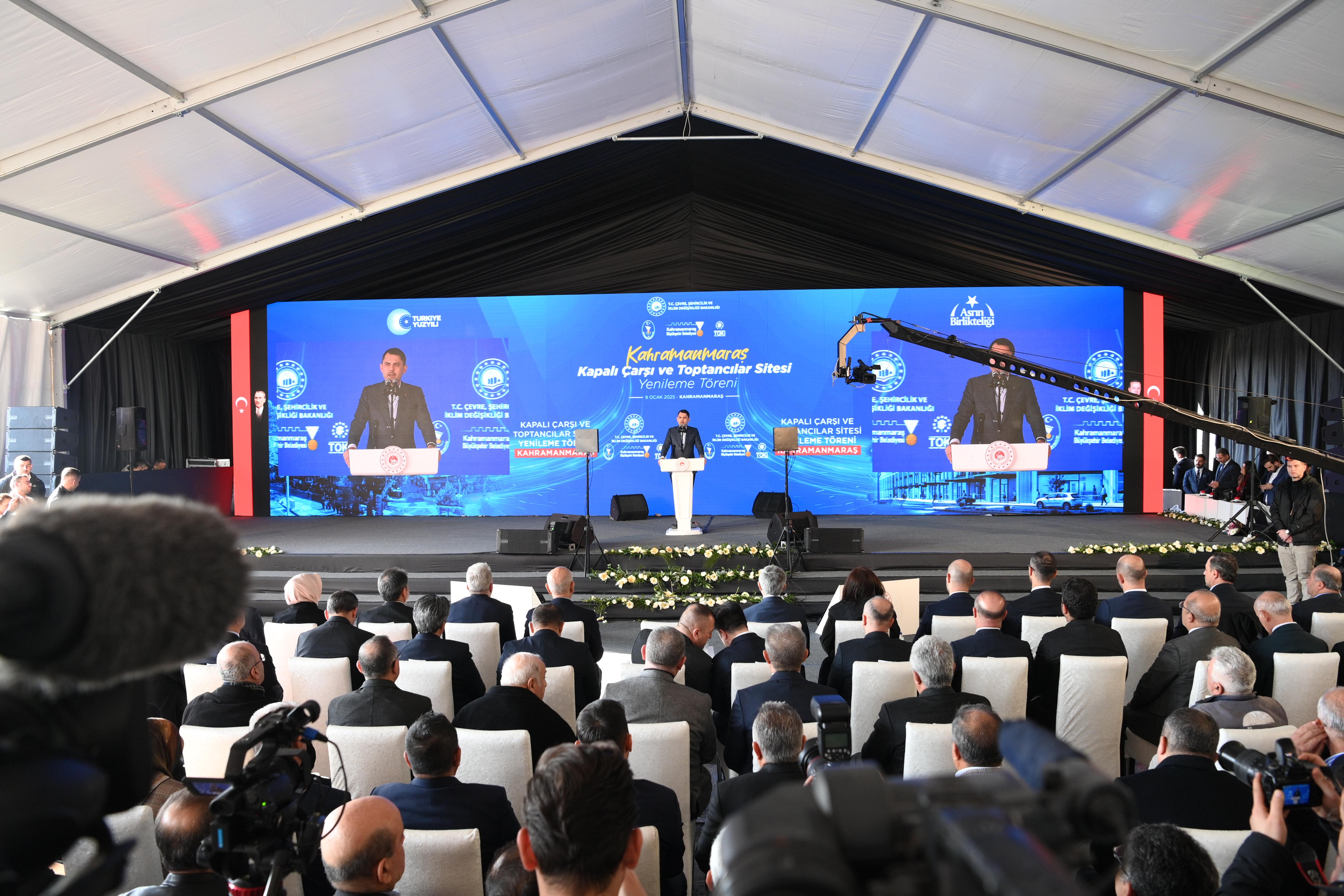 Bakan Murat Kurum, “Şehrimizde yaptığımız konutların yanında medeniyetimizin bin yıllık izlerini taşıyan, tarih ve kültürle yoğurulmuş çarşılarımızı da ihya ediyoruz. Kapalı Çarşımızda restorasyon çalışmalarımıza başladık. Tarihi Demirciler Çarşı’mızın yenileme sürecini başlatıyoruz. Aynı anlayışla Kasaplar Çarşısı’nda da yenileme sürecini başlatacağız. 117 dükkânlık Toptancılar Sitesi’ni de yeniliyoruz. İnşallah bu projemizi de Ağustos ayı içerisinde tamamlamayı hedefliyoruz. İnşallah bu projemizle şehrimizin ticari hayatı daha da canlanacak, istihdam artacak. Projelerimizin Kahramanmaraşlı hemşehrilerimize hayırlı olmasını diliyorum” diye konuştu.