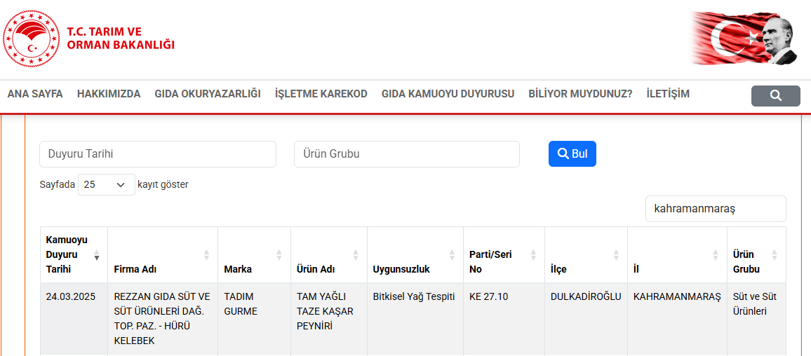 Bu kapsamda Kahramanmaraş'tan da iki firmanın adı listede yer aldı. Denetimler sonucunda, Tadım Gurme markasının tam yağlı taze kaşar peyniri ürününde bitkisel yağ tespit edildiği açıklandı.